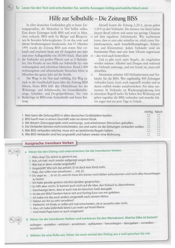 Aspekte B1+ Arbeitsbuch: Textverständnis "Obdachlosigkeit" und Aussprache trennbare Verben