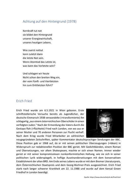 Am 6. Mai 1921 kam der jüdische Schriftsteller Erich Fried in Wien zur Welt. Von der engeren Familie überlebten nur er und seine Mutter die Shoah. Im Londoner Exil hielt er sich für einige Jahre mit Jobs in Fabriken über Wasser und fand nur langsam eine neue „Heimat“. Die traumatischen Erfahrungen schärften früh sein kritisches Bewusstsein. Obwohl sein Leben lang ein Linker, kritisierte er nach dem Krieg beide Seiten des „Eisernen Vorhangs“ gleichermaßen. In seinem Kampf gegen Ungerechtigkeit und Heuchelei schonte er weder seine Gegner, noch sich selbst.